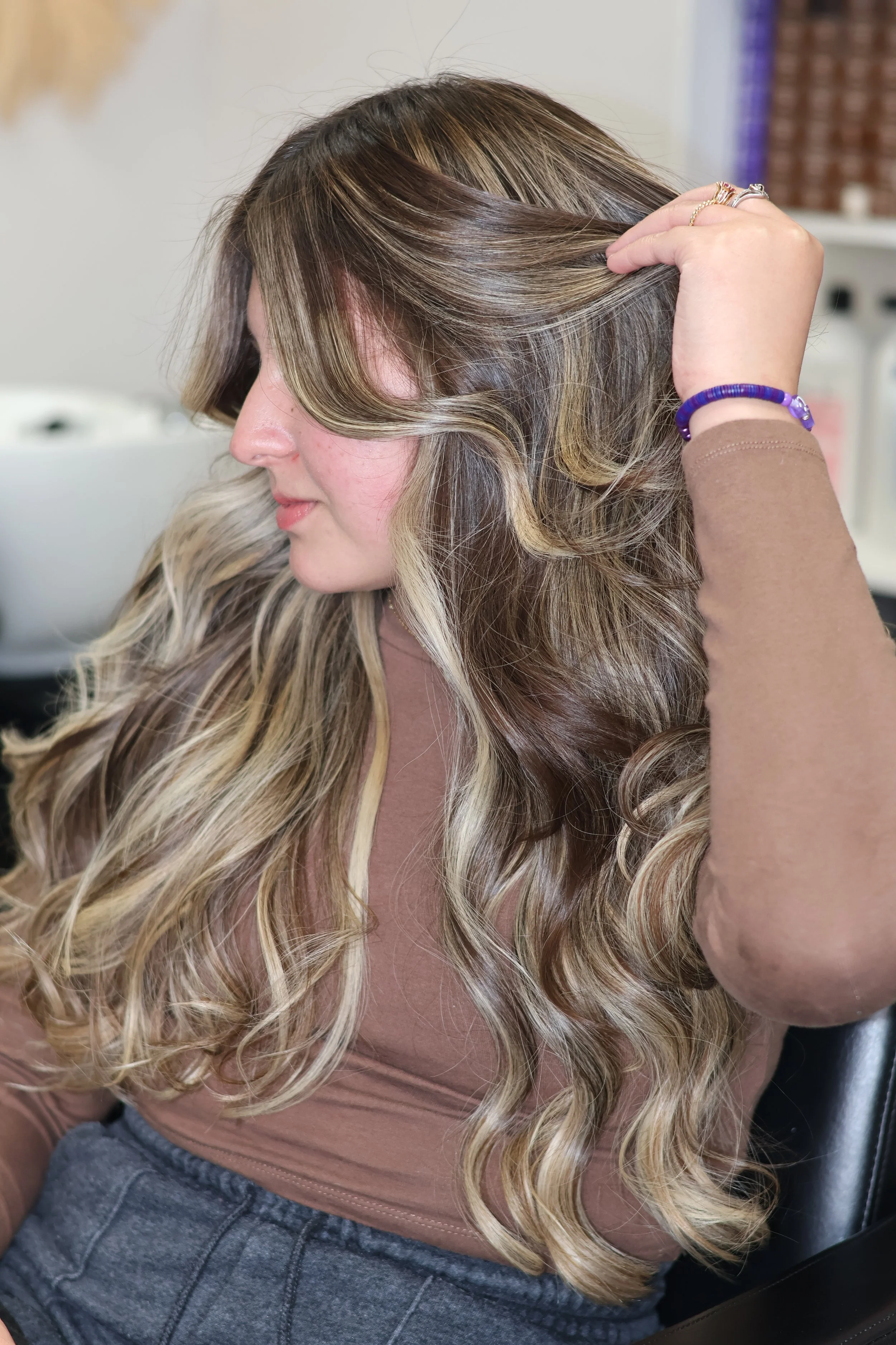 Este balayage combina una base castaña con reflejos en tonos caramelo, miel y vainilla, aplicados con precisión para lograr una fusión suave y luminosa. La transición entre colores es sutil y bien difuminada, aportando profundidad y brillo al cabello. El resultado es un look cálido, elegante y moderno, con dimensión y movimiento natural, ideal para realzar el rostro y mantener un estilo sofisticado con poco mantenimiento.